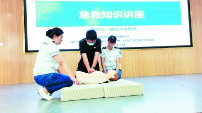 7月25日,中铁四局(北)京台(北)高速公路改扩建三标项目部联合曲阜市中医院开展“企地共建讲安全 应急演练保生产”活动。活动过程中,曲阜市中医院医生、专家详细讲授急救知识,同时现场手把手教学、演练应急抢救。 (鲁颖 摄)