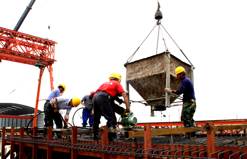 9月15日下午14时28分,七分公司西安三星电子快速干道S-C02标段梁场鞭炮齐鸣,伴随着第一车混凝土的浇筑,梁场第一片梁生产正式开始,这也标志着该梁场大批量生产的开始。
