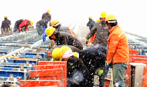 员工们顶风冒雪进行轨排框架起道施