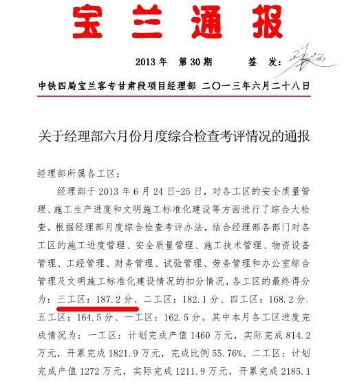 6月17日接到通知,甘青公司对宝兰客专全线开展第二季度信誉评价大检查,为此三工区立即召开迎检专题会议,并对照检查内容针对现场安全质量、文明施工、内业资料、管理制度制定迎检工作分工表,落实责任人,充分做好迎检准备。宝兰客专三工区各部门白天做好施工现场及常规工作,晚上各部门互相配合,统一在会议室加班落实检查项目,经过一周的努力,宝兰三工区最终在甘青公司信誉评价检查中,在资源配备、管理制度、现场管理、过程控制四个方面的标准化建设中受到高度的评价和肯定。