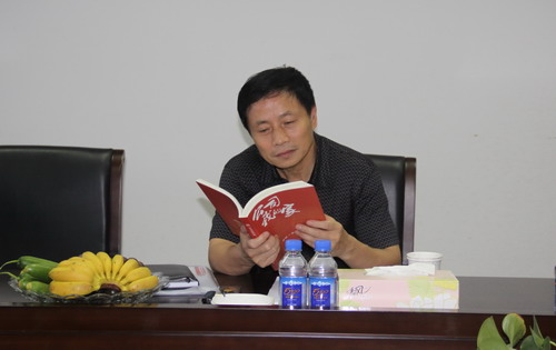 局组织部部长汪受泉饶有兴致地翻阅公司党委编发的《公司,我的家》一书