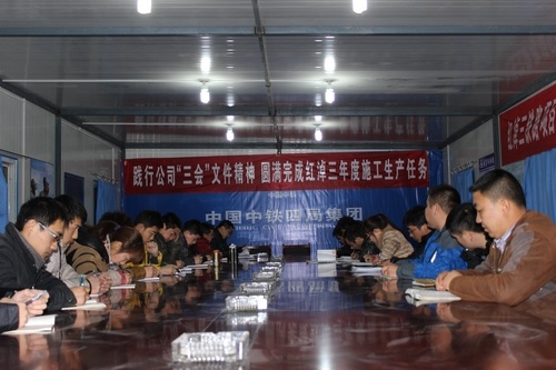 2013年3月6日,红淖三铁路项目S2、S3标工程指挥部在会议室召开全体员工大会学习贯彻公司“三会”精神。