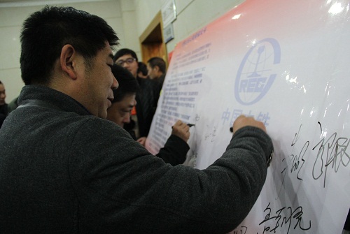 职工代表在《传递企业正能量倡议书》上签名